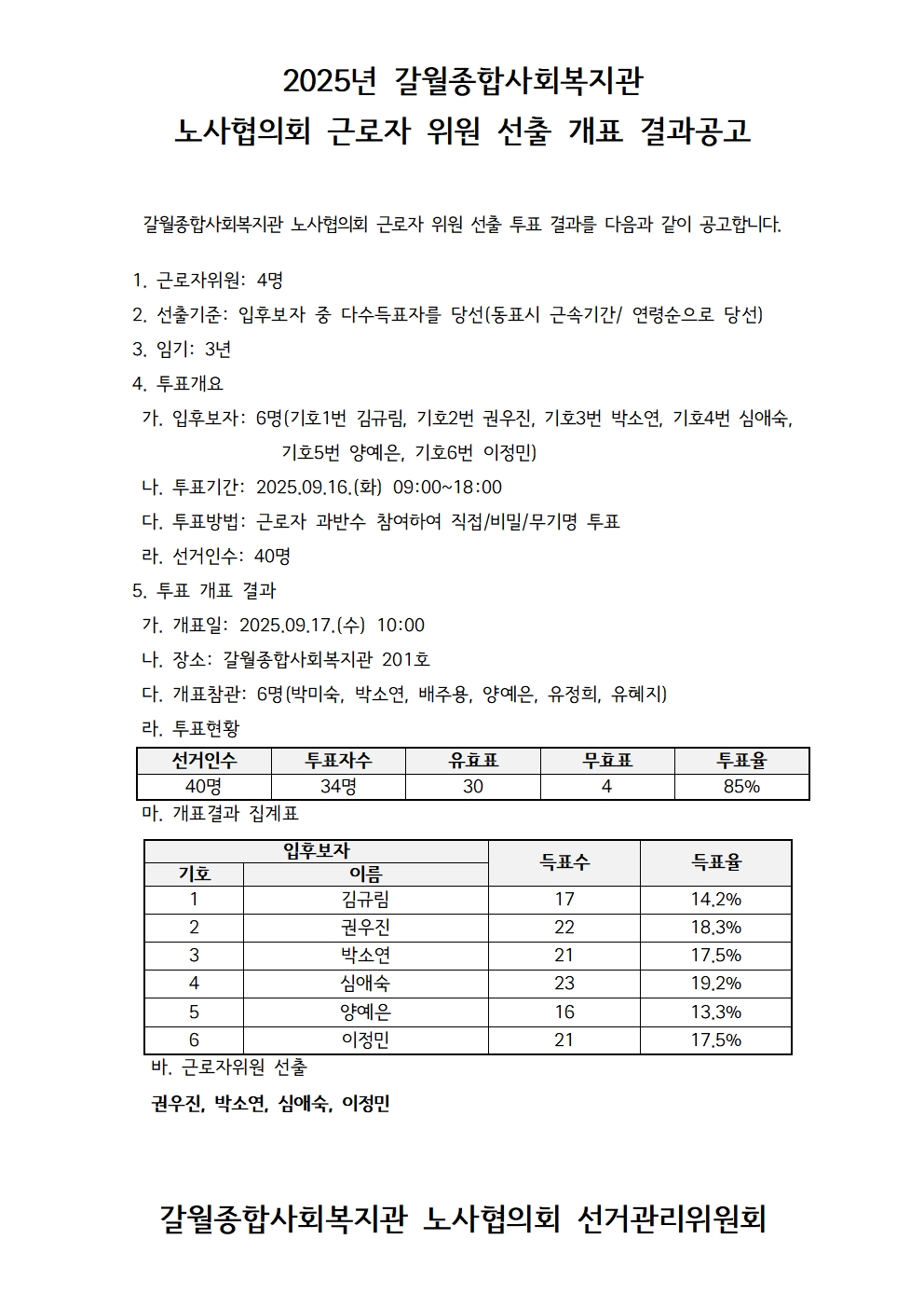 2025년 갈월종합사회복지관 노사협의회 근로자 위원 선출 개표 결과공고