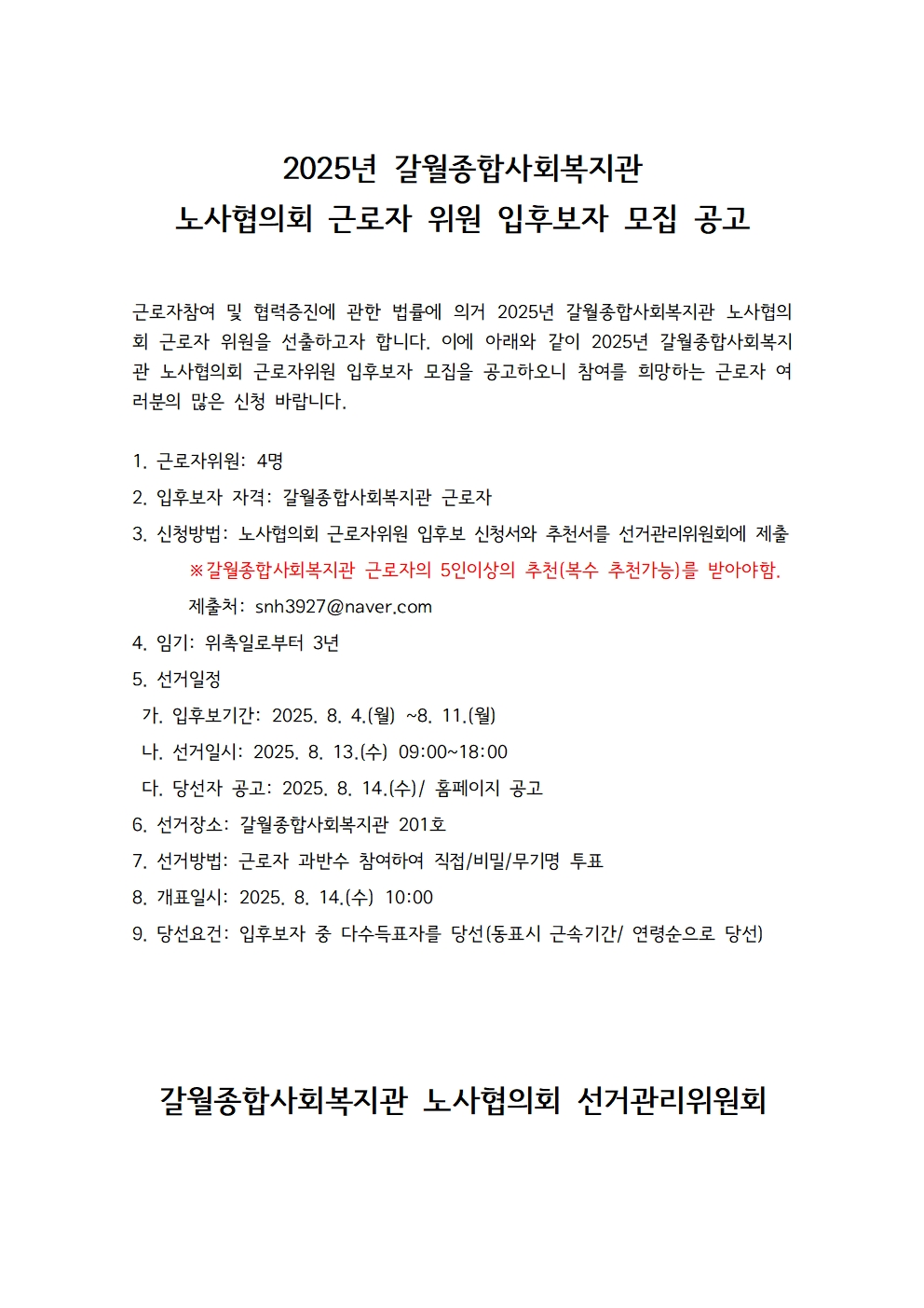 2025년 갈월종합사회복지관 노사협의회 근로자 위원 입후보자 모집 재공고
