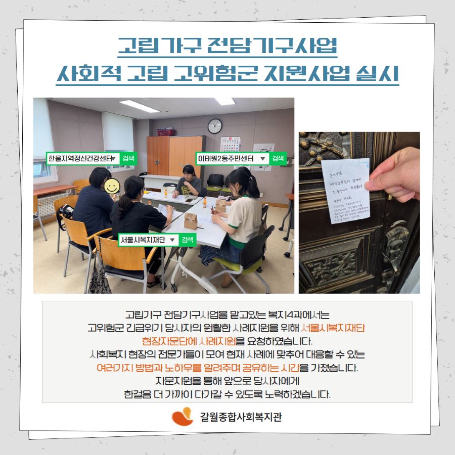 고립가구 전담기구 사업을 진행하고 있는 복지4과에서는