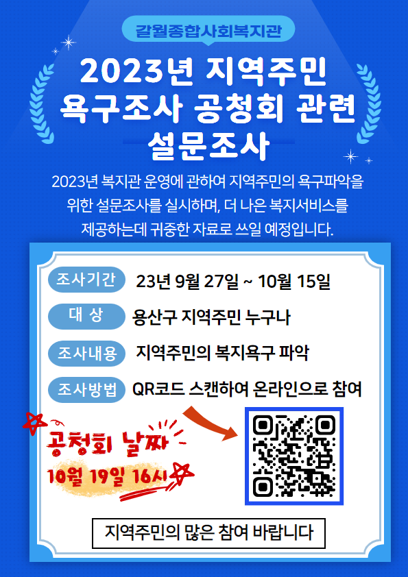 갈월종합사회복지관에서 지역주민 욕구파악을 위해 공청회를 진행합니다.